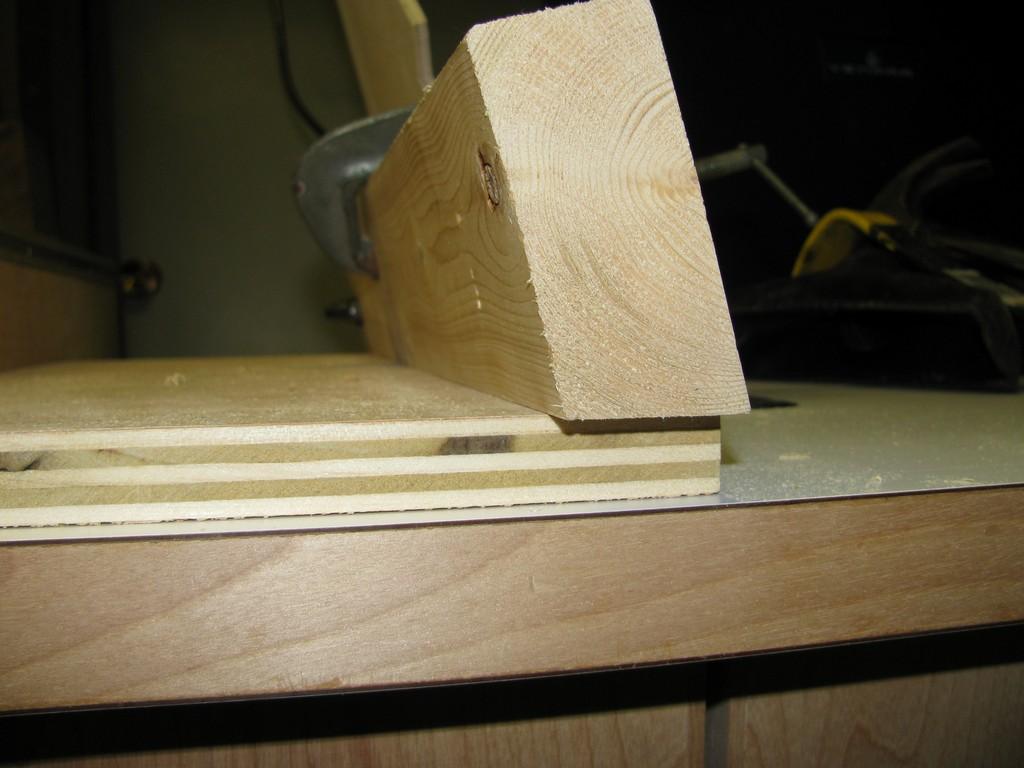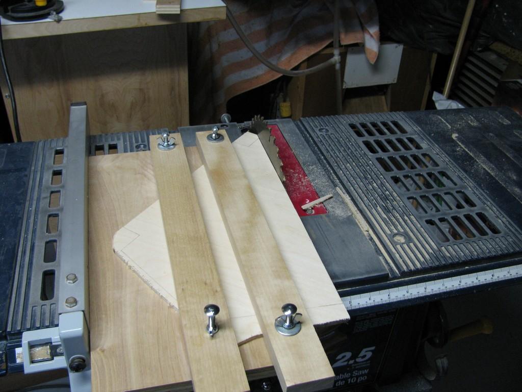 "Jig" pour tenir la pièce de bois pour pouvoir faire des coupes droites pour les ailes et garder les doigts loin de la lame |
