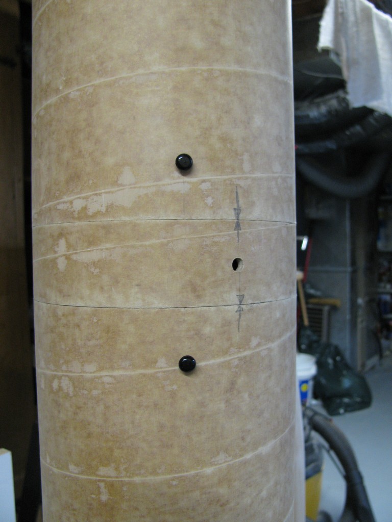 | On voit ici la section pour l'électronique ainsi que les section pour le parachute principal et le drogue. On apperçoit aussi les rivets qui devraient tenir le tout ensemble. Il y a 4 rivets par section. | |