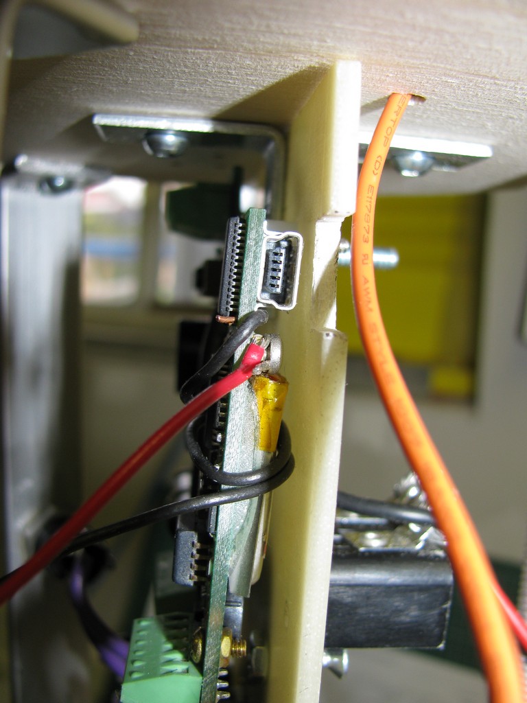 même vis, mais elle est vissé sur le dessus de la plaquette et fait contact sur le circuit. Le fils noir est inséré dans le petit trous près du circuit EFTDI (port USB). Une goutte de plomb pour tenir le tout en place. La seconde connexion pour l'interrupteur est faite grâce à la vis de l'autre coté de la plaquette. (voir prochaine photo) |